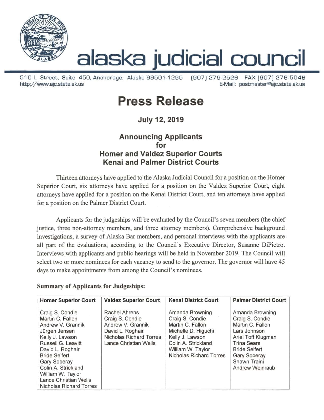Applicants for the judgeships will be evaluated by the Alaska Judicial Council’s seven members. Interviews with applicants and public hearings will be held November 2019 and the Council will select two or more nominees for each vacancy to send to the governor. The governor will have 45 days to make appointments from among the Council’s nominees.