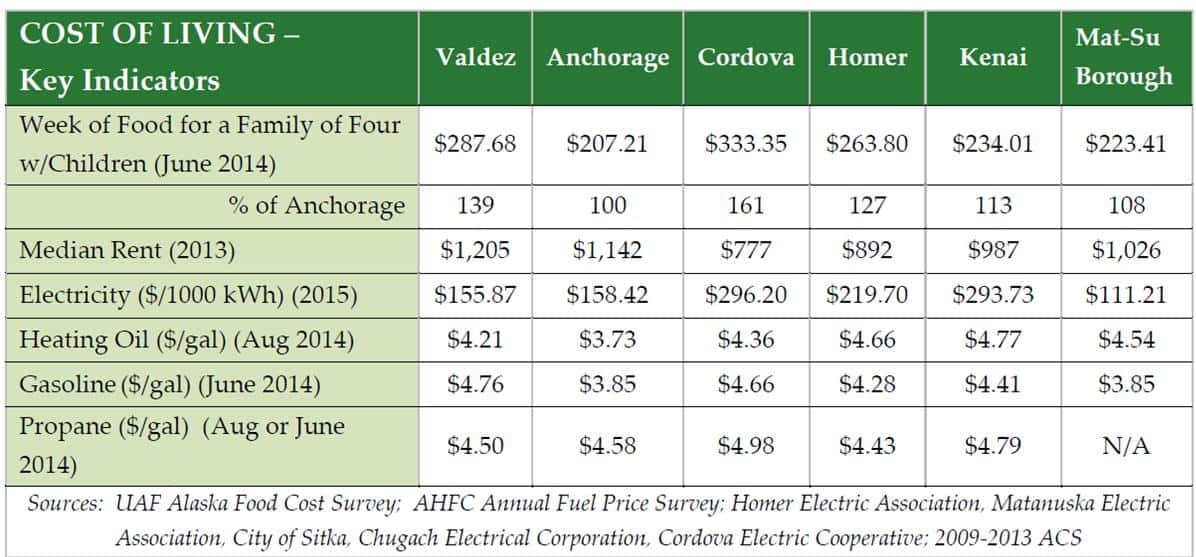 The cost of rent, food, and gasoline ranks Valdez at or near the most expensive compared to five other southcentral Alaska places. Compared to these same places, heating oil, electricity, and propane are relatively more affordable. A large proportion of Valdez’s housing stock is older and less efficient, and over a quarter of the city’s housing stock is in mobile homes. This combined with the harsh climate result in Valdez residents spending an average of 13% of their income on household energy, more than the comparison Southcentral communities.